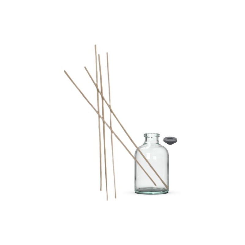 Contenido: 1 envase de vidrio con capacidad de 120 ml con tapón y 5 varitas de ratán.